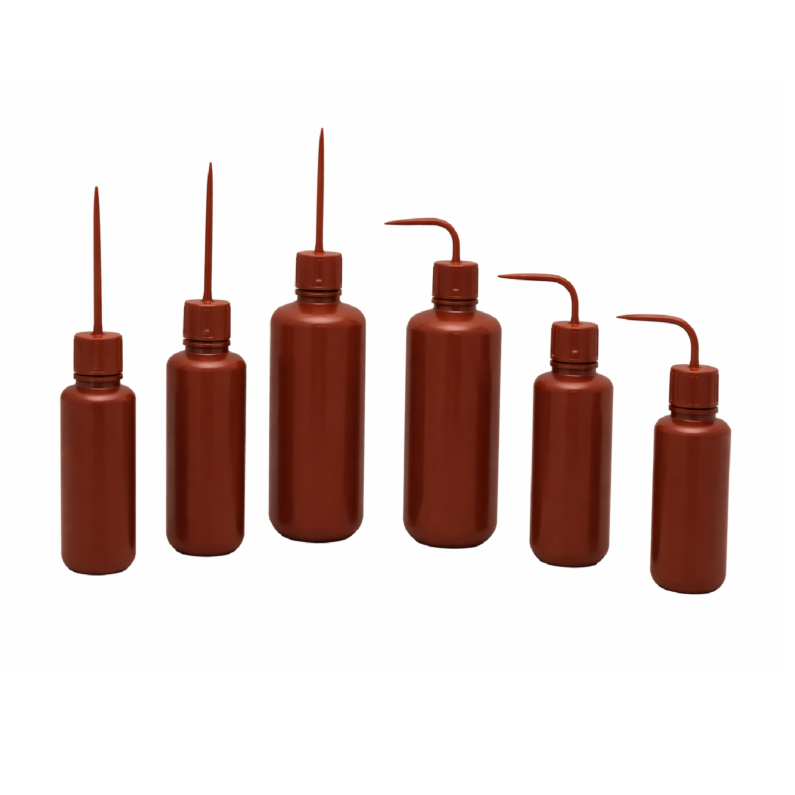 A coloração âmbar auxilia na proteção do conteúdo contra a incidência luminosa, sendo especialmente recomendada para o acondicionamento e manuseio de reagentes fotossensíveis. Possui tampa rosqueável, disponível com bico curvo ou bico reto, proporcionando melhor direcionamento do jato, controle do fluxo e segurança durante o uso.